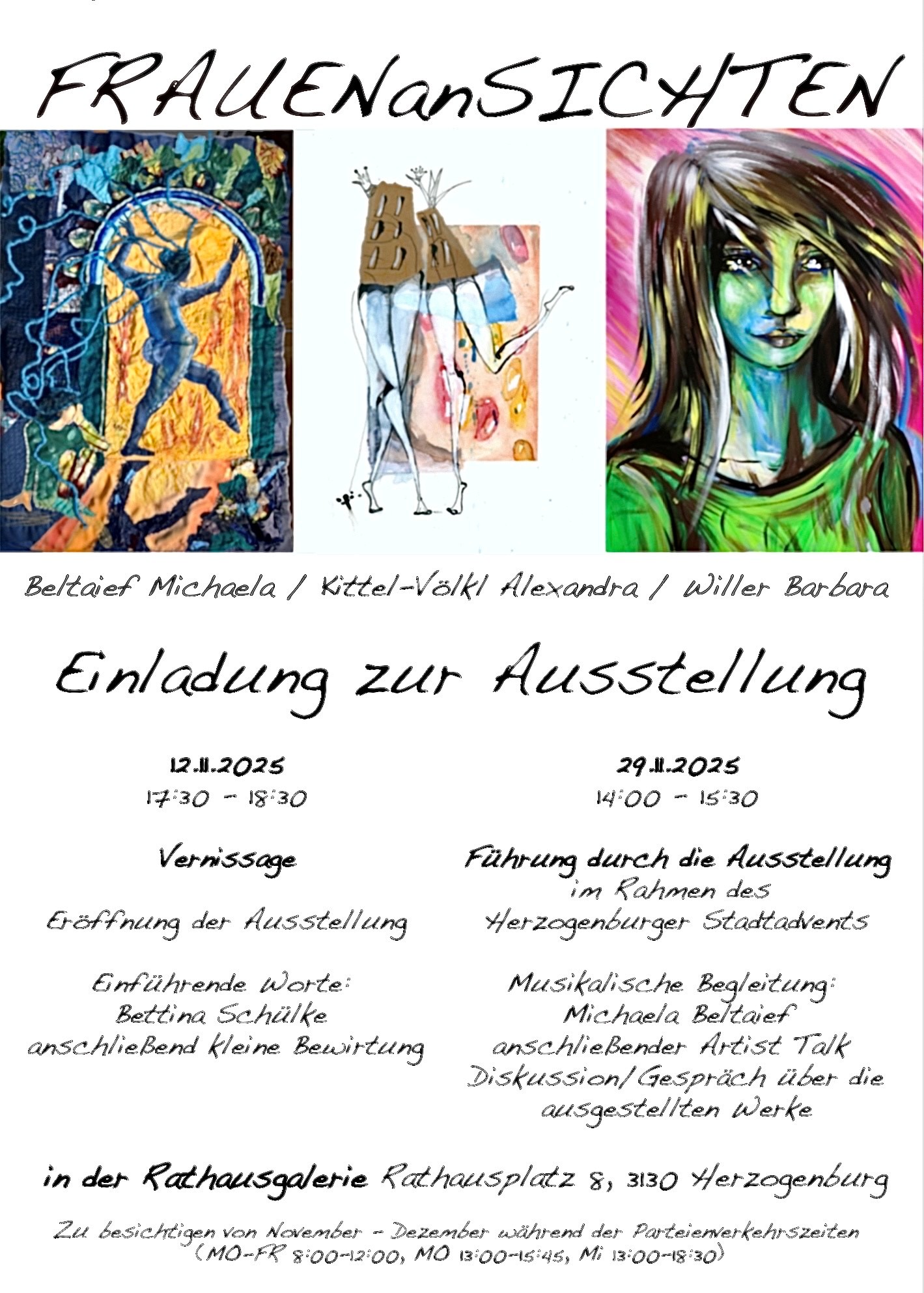 In Zusammenarbeit mit der VHS Herzogenburg präsentieren die Künstlerinnen Michaela Beltaief, Barbara Willer, Alexandra Kittel-Völkl und Kursleiterin Bettina Schülke die Ausstellung "FRAUENanSICHTEN".
